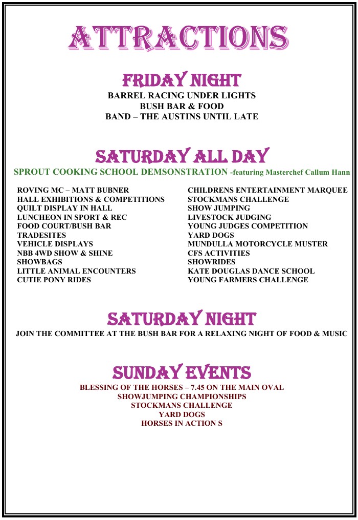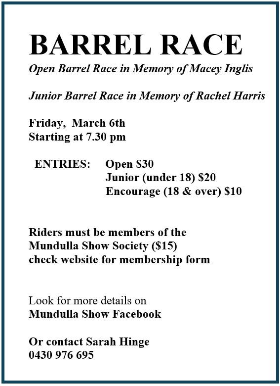 The Mundulla Show’s official Show Day in 2026 is Saturday, March 7th with Horse Events beginning on the Friday and continuing on Sunday, March 8th